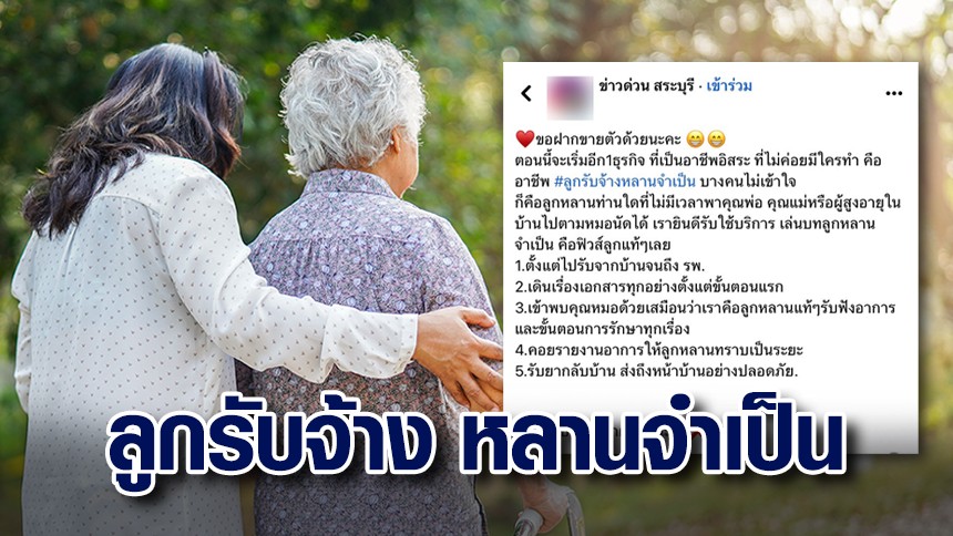ผู้ใช้เฟซบุ๊กรายหนึ่ง โพสต์ผ่านกลุ่ม “ข่าวด่วน สระบุรี” ระบุข้อความว่า ขอฝากขายตัวด้วยนะคะ ตอนนี้จะเริ่มอีก 1 ธุรกิจ ที่เป็นอาชีพอิสระ ที่ไม่ค่อยมีใครทำ คือ อาชีพลูกรับจ้าง หลานจำเป็น บางคนไม่เข้าใจ ก็คือลูกหลานท่านใดที่ไม่มีเวลาพาคุณพ่อคุณแม่หรือผู้สูงอายุในบ้านไปตามหมอนัดได้ เรายินดีรับใช้บริการ เล่นบทลูกหลานจำเป็น คือฟีลลูกแท้ๆ เลย