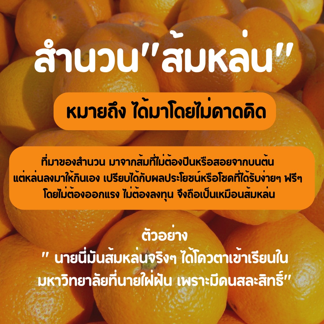 โดยในสำนวนไทย คำว่าส้มหล่น หมายถึง ต้นส้มที่มีลูกส้ม ซึ่งปกติลูกส้มจะสุกจนเน่าคาต้น ถ้าอยากกินต้องปีนต้นเพื่อไปเก็บ โชคดีมีลูกส้มสุกตกจากต้นลงให้กินเอง โชคที่ได้รับง่ายๆ ฟรีๆ โดยไม่ต้องออกแรงนั่นเอง ที่มา วิกิพจนานุกรม ตัวอย่างการใช้ นายนี่มันส้มหล่นจริงๆ ได้โควตาเข้าเรียนในมหาวิทยาลัยที่นายใฝ่ฝัน เพราะมีคนสละสิทธิ"