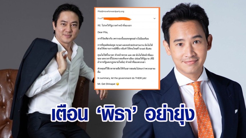 'เก็ต ชินภัสร์' ส่งอีเมลถึง 'พิธา' เตือนอย่ายุ่งเหตุสู้รบอิสราเอล ลั่นคุณไม่ใช่นายกฯ