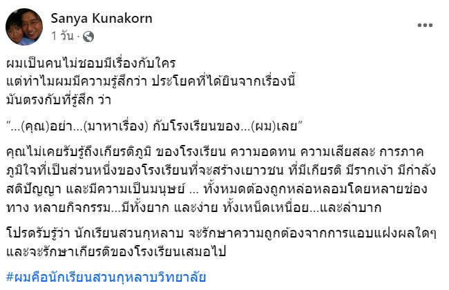 ล่าสุด “ดู๋ - สัญญา คุณากร” พิธีกรชื่อดัง และเป็นศิษย์เก่าโรงเรียนสวนกุหลาบวิทยาลัย โพสต์ข้อความผ่านทางเฟซบุ๊ก เกี่ยวกับกระแสดรามาดังกล่าว โระบุว่า “ผมเป็นคนไม่ชอบมีเรื่องกับใคร แต่ทำไมผมมีความรู้สึกว่า ประโยคที่ได้ยินจากเรื่องนี้มันตรงกับที่รู้สึก ว่า “…(คุณ)อย่า…(มาหาเรื่อง) กับโรงเรียนของ…(ผม)เลย” คุณไม่เคยรับรู้ถึงเกียรติภูมิ ของโรงเรียน ความอดทน ความเสียสละ การภาคภูมิใจที่เป็นส่วนหนึ่งของโรงเรียนที่จะสร้างเยาวชน ที่มีเกียรติ มีรากเง้า มีกำลังสติปัญญา และมีความเป็นมนุษย์ … ทั้งหมดต้องถูกหล่อหลอมโดยหลายช่องทาง หลายกิจกรรม…มีทั้งยาก และง่าย ทั้งเหน็ดเหนื่อย…และลำบาก”
