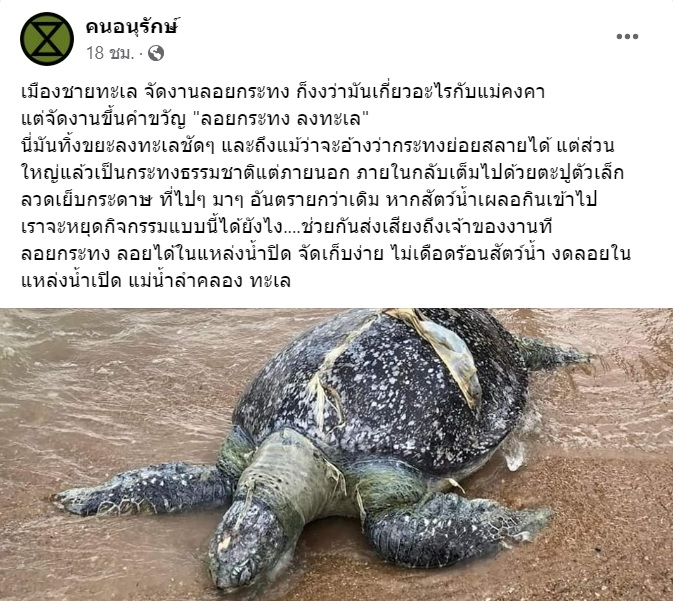 โดยเฟซบุ๊กเพจ คนอนุรักษ์ ได้แชร์ภาพเต่าทะเลที่ต้องตายจากการที่มนุษย์ลอยกระทงเมื่อปีที่แล้ว พร้อมแสดงความคิดเห็นว่า “เมืองชายทะเล จัดงานลอยกระทง ก็งงว่ามันเกี่ยวอะไรกับแม่คงคาแต่จัดงานขึ้นคำขวัญ "ลอยกระทง ลงทะเล" นี่มันทิ้งขยะลงทะเลชัดๆ และถึงแม้ว่าจะอ้างว่ากระทงย่อยสลายได้ แต่ส่วนใหญ่แล้วเป็นกระทงธรรมชาติแต่ภายนอก ภายในกลับเต็มไปด้วยตะปูตัวเล็ก ลวดเย็บกระดาษ ที่ไปๆ มาๆ อันตรายกว่าเดิม หากสัตว์น้ำเผลอกินเข้าไป เราจะหยุดกิจกรรมแบบนี้ได้ยังไง....ช่วยกันส่งเสียงถึงเจ้าของงานที ลอยกระทง ลอยได้ในแหล่งน้ำปิด จัดเก็บง่าย ไม่เดือดร้อนสัตว์น้ำ งดลอยในแหล่งน้ำเปิด แม่น้ำลำคลอง ทะเล”