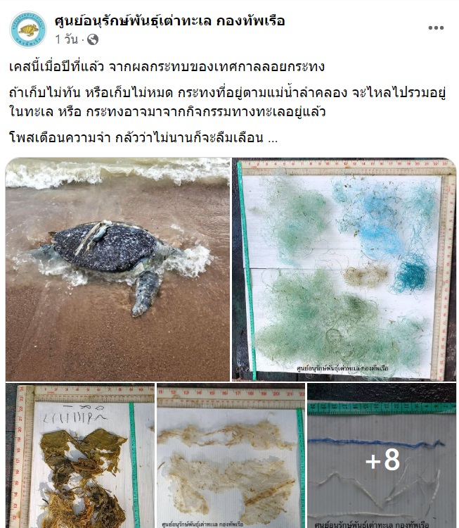 ขณะที่ ศูนย์อนุรักษ์พันธุ์เต่าทะเล กองทัพเรือ ได้แชร์โพสต์ย้ำเตือนความจำจากเหตุการณ์เมื่อปีที่แล้ว ที่เต่าทะเลต้องสังเวยชีวิตเพราะมนุษย์ลอยกระทงลงทะเลว่า "เคสนี้เมื่อปีที่แล้ว จากผลกระทบของเทศกาลลอยกระทง ถ้าเก็บไม่ทัน หรือเก็บไม่หมด กระทงที่อยู่ตามแม่น้ำลำคลอง จะไหลไปรวมอยู่ในทะเล หรือ กระทงอาจมาจากกิจกรรมทางทะเลอยู่แล้ว โพสต์เตือนความจำ กลัวว่าไม่นานก็จะลืมเลือน…”