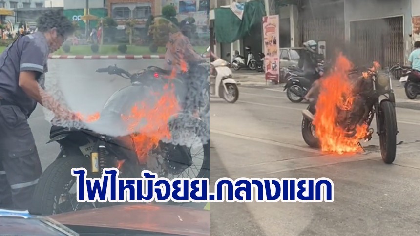 ระทึก! ไฟไหม้จยย. กลางแยก เจ้าของพยายามดับ สุดท้ายไม่เป็นผลไฟลุกท่วมหนัก