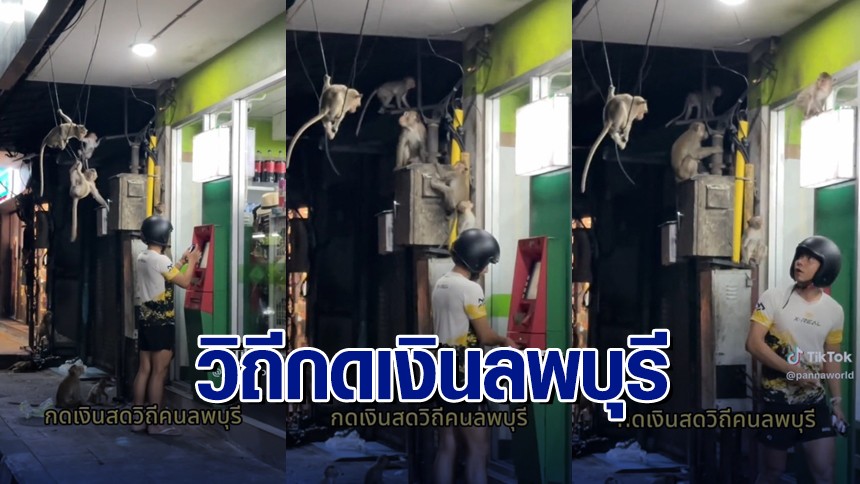 ล่าสุด ผู้ใช้ติ๊กต็อก @pannaworld เผยแพร่คลิป พร้อมระบุข้อความ “กดเงินสดวิถีคนลพบุรี” โดยคลิปดังกล่าว เห็นชายรายหนึ่งสวมหมวกกันน็อก กำลังยืนกดเงินสดที่ตู้เอทีเอ็มหน้าร้านสะดวกซื้อด้วย ท่ามกลางฝูงลิงที่โหนสายไฟกำลังจ้องชายคนดังกล่าวอยู่ หลังใช้บริการเสร็จสิ้นรีบกำเงินแล้วเดินออกมาอย่างว่องไว กลายเป็นไวรัลมีคนดูกว่า 2 ล้านครั้ง