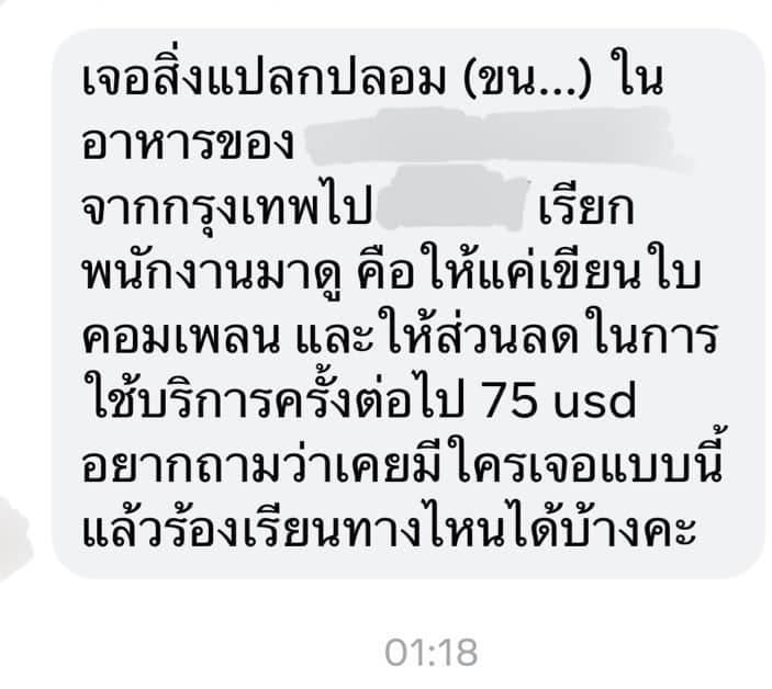 นอกจากนี้ยังมีข้อความที่ต้นโพสต์เขียนระบุด้วยว่า “เจอสิ่งแปลกปลอม (ขน...) ในอาหารของ ..... จากกรุงเทพ ไป .... เรียกพนักงานมาดู คือให้แค่เขียนใบคอมเพลน และให้ส่วนลดในการใช้บริการครั้งต่อไป 75 USD อยากถามว่าเคยมีใครเจอแบบนี้แล้วร้องเรียนทางไหนได้บ้างคะ”