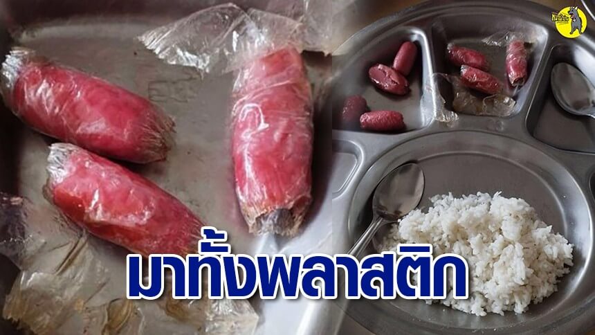 เพจดังแฉ รร.ทำอาหารให้เด็กกินมื้อเช้า เมนูไส้กรอกแดงทอด มาพร้อมพลาสติก