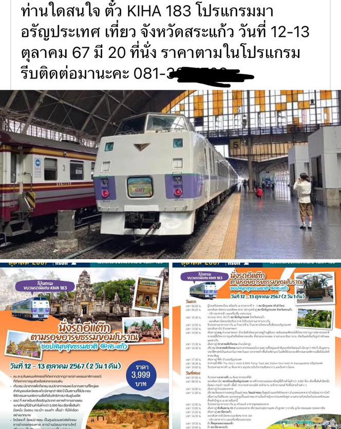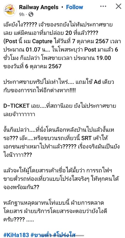 กลายเป็นประเด็นที่พูดถึงในโลกออนไลน์ เมื่อเฟซบุ๊ก Railway Angels ได้โพสต์ข้อความ ตั้งคำถามถึงการรถไฟแห่งประเทศไทย หลังจากเห็นผู้โพสต์ขายตั๋วรถไฟบนโลกออนไลน์ ข้อความว่า “ท่านใดสนใจ ตั๋ว KIHA 183 โปรแกรมมาอรัญประเทศ เที่ยวจังหวัดสระแก้ว วันที่ 12-13 ตุลาคม 67 มี 20 ที่นั่ง ราคาตามในโปรแกรม รีบติดต่อมานะคะ” ทั้งที่เว็บทางการยังไม่ได้เปิดขาย