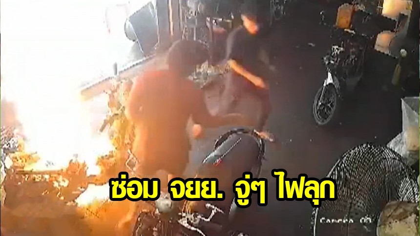 อุทาหรณ์ช่างซ่อม! คลิปหนุ่มปทุมฯ ซ่อม จยย. จู่ๆ ไฟลุก ลามถังน้ำมัน ยังดีมีสติ ดับเพลิงทัน