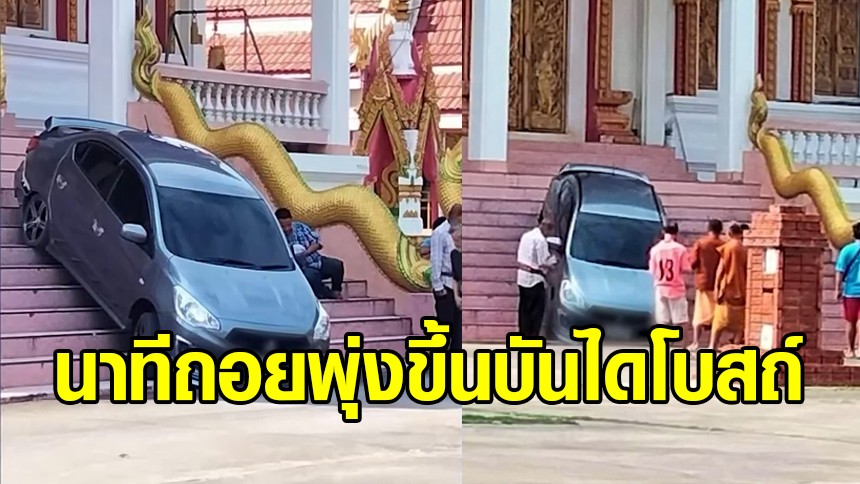 นาทีชีวิต พ่อลูกขับรถเก๋ง แวะเข้าห้องน้ำวัด เข้าเกียร์ถอยหลัง แต่เกียร์ค้าง ทำรถถอยพุ่งขึ้นบันไดโบสถ์ สองพ่อลูกสุดช็อก นั่งตัวสั่นในรถที่นิ่งค้างบนบันได เคราะห์ดีทั้งคู่ไม่ได้รับบาดเจ็บ แต่รถเสียหายหนัก ด้านเจ้าอาวาสวัด ไม่ติดใจเอาเรื่อง เพราะเป็นอุบัติเหตุ วัดไม่ได้เสียหายอะไร