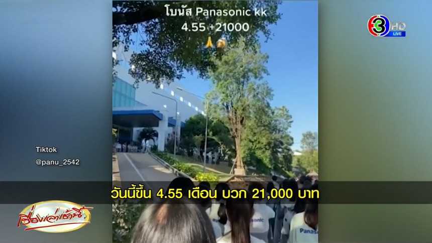 ผู้ใช้ติ๊กต่อก ท่านหนึ่งได้โพสต์คลิปวิดิโอ ขณะที่โรงงาน พานาโซนิค จ.ขอนแก่น ได้ประกาศแจกโบนัสพนักงานแบบจุกๆ 4.55 เดือน บวกเงินอีก 21,000 บาท กันไปเลย ทำเอาพนักงานถึงกับปรบมือเฮลั่น พร้อมกับส่งเสียง "เลิศๆๆ"