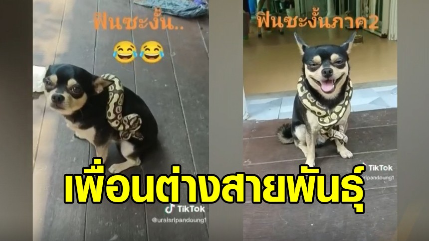 น้องหมา 'เจ้าเห็ดเผาะ' ทำหน้าฟิน โดนเจ้างูเพื่อนซี้พันคอ