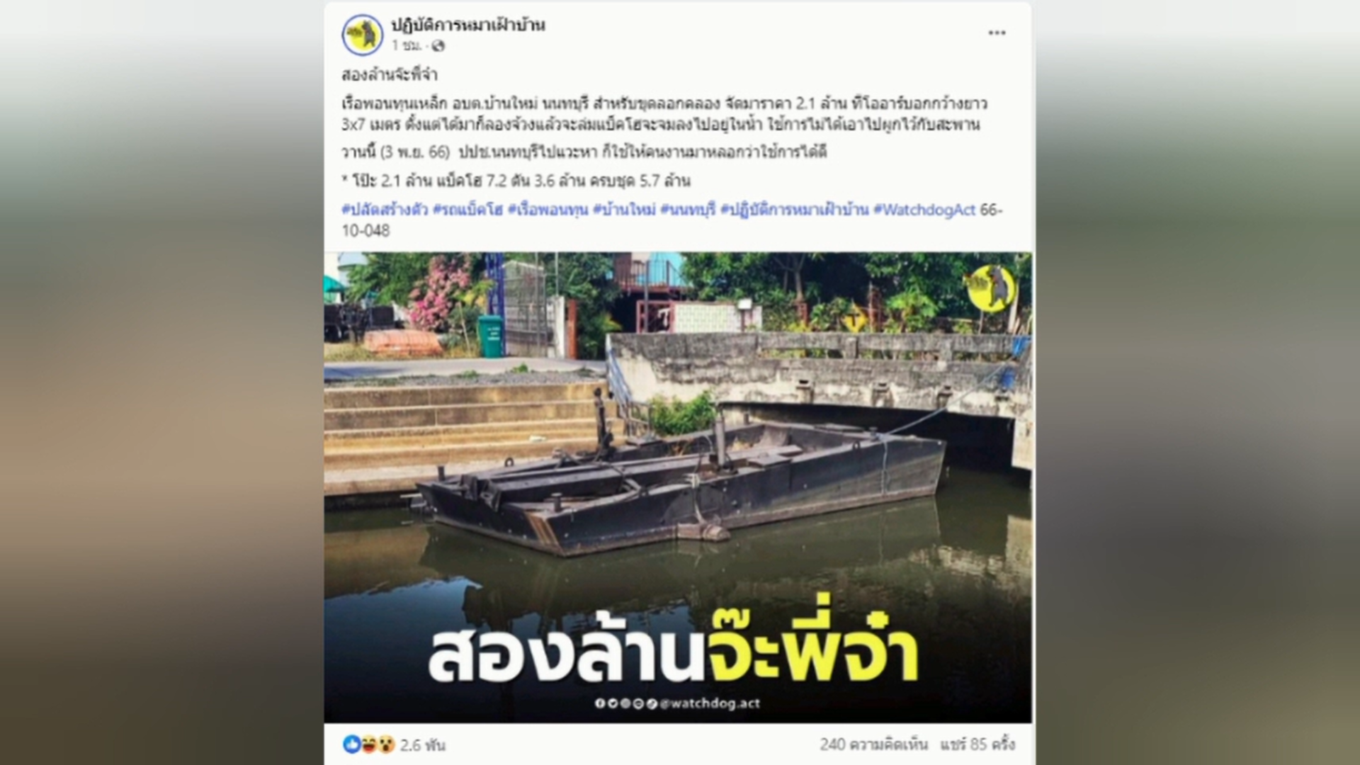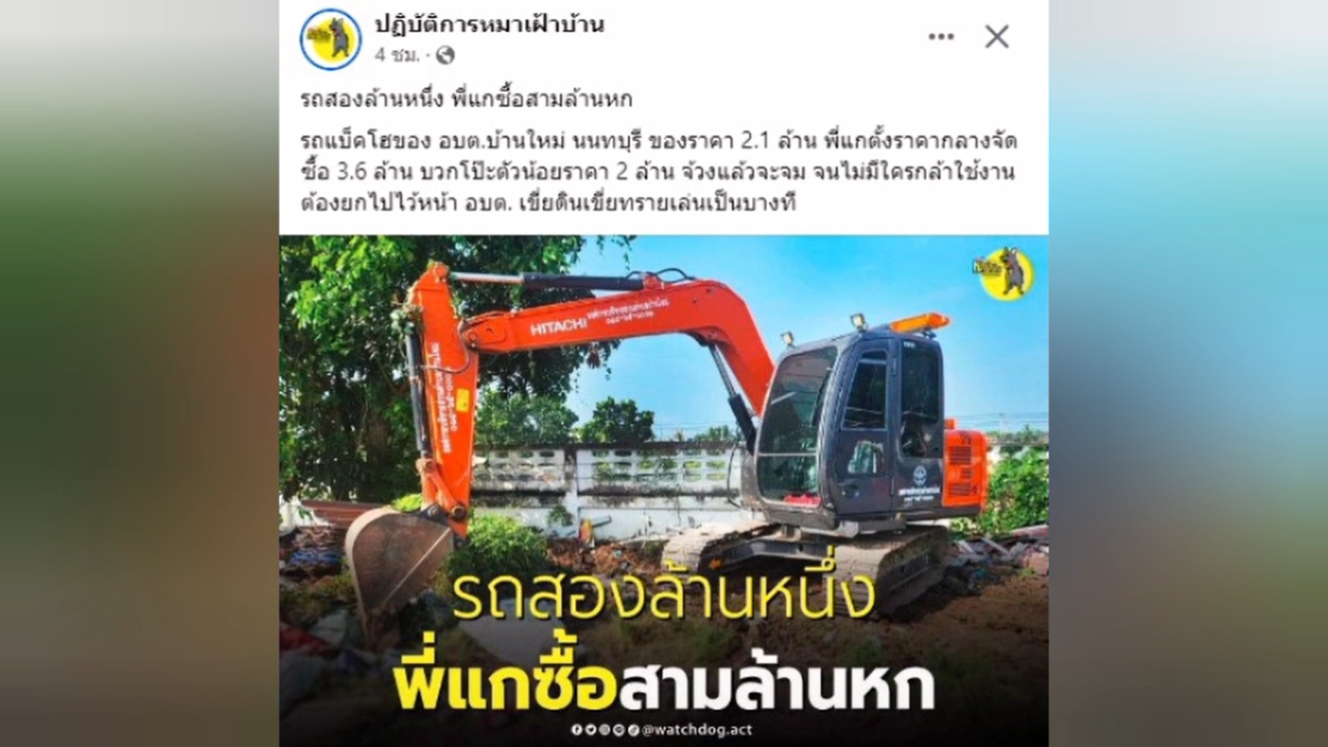 จากกรณีปรากฏเป็นข่าวในสื่อออนไลน์ ในเพจเฟซบุ๊กปฏิบัติการหมาเฝ้าบ้าน ว่า “อบต.บ้านใหม่ อ.บางใหญ่ จ.นนทบุรี จัดซื้อครุภัณฑ์ก่อสร้างรถขุดไฮดรอลิกแบบตีนตะขาบ พร้อมเรือพอนทุนเหล็กบรรทุกรถ สูง 1.2 เมตร ไว้ใช้ชุดหนึ่ง ราคาแรง 5,768,000 บาท จัดซื้อกันยา ส่งมอบธันวา 64 ได้ของมาแล้ว พาลงคลองหน้า อบต. ทดลองจ้วงแล้วเรือจะล่มจนไม่มีใครกล้าใช้ รถถูกยกไปไว้หน้าสนามกีฬาตักหินตักทรายเล่นเป็นคราว ๆ