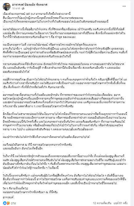 อยากขอโทษเพื่อนร่วมงานทั้งในอดีตและปัจจุบัน ที่การกระทำของผมทำให้ทุกคนต้องเดือนร้อน อยากขอโทษน้องผู้หญิงคนนั้นและอีกหลายคนที่คำพูดของผมมันทำร้ายและส่งผลเสียอย่างที่สุดต่อเค้าเหล่านั้น และสุดท้ายผมอยากขอโทษสังคมที่เคยตั้งความหวังไว้กับคนอย่างผม แต่ก็ถูกผมเองนี่แหละที่ทำลายความหวังเหล่านั้น บรรดาสิ่งต่าง ๆ เหล่านี้ผมขอโทษจากใจจริงครับ