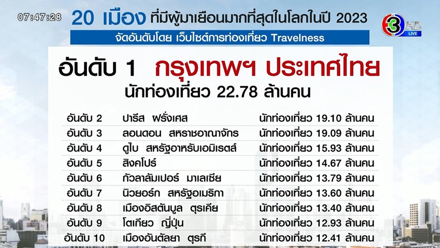 เว็บไซต์การท่องเที่ยว Travelness ได้จัดอันดับ 20 เมืองที่มีนักท่องเที่ยวต่างชาติเดินทางเยือนมากที่สุดในโลก ปี 2023 หรือ The Most Visited Cities in the World โดยจัดอันดับตามจำนวนนักท่องเที่ยวที่เดินทางมาเที่ยวจากต่างประเทศและได้มีการใช้จ่ายข้ามประเทศ ซึ่งกรุงเทพฯ เมืองหลวงของประเทศไทย ติดอันดับ 1 เมืองที่มีผู้มาเยือนมากที่สุดในโลก ปี 2023 โดยมีนักท่องเที่ยวมาถึง 22.78 ล้านคน แซงปารีส ประเทศฝรั่งเศส นอกจากนี้ยังมีอีก 2 เมืองของไทย คือพัทยาและภูเก็ต ที่ติดอันดับ 1 ใน 20 ด้วย