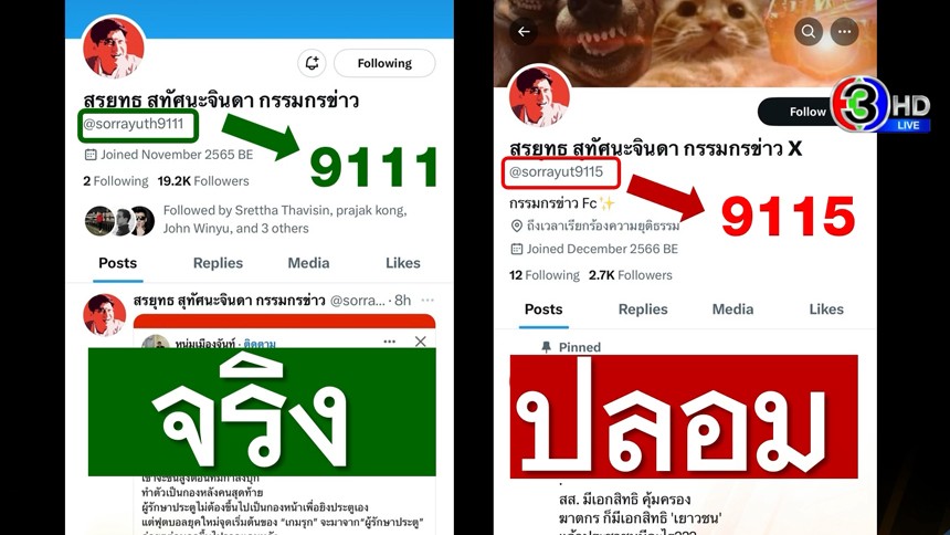 จากกรณี 'คดีป้าบัวผัน' ตอนนี้มีทวิตเตอร์ปลอมของ นายสรยุทธ สุทัศนะจินดา ผู้ประกาศข่าวช่อง 3 โดยใช้ชื่อว่า สรยุทธ สุทัศนะจินดา กรรมกรข่าว X (@sorrayut9115)