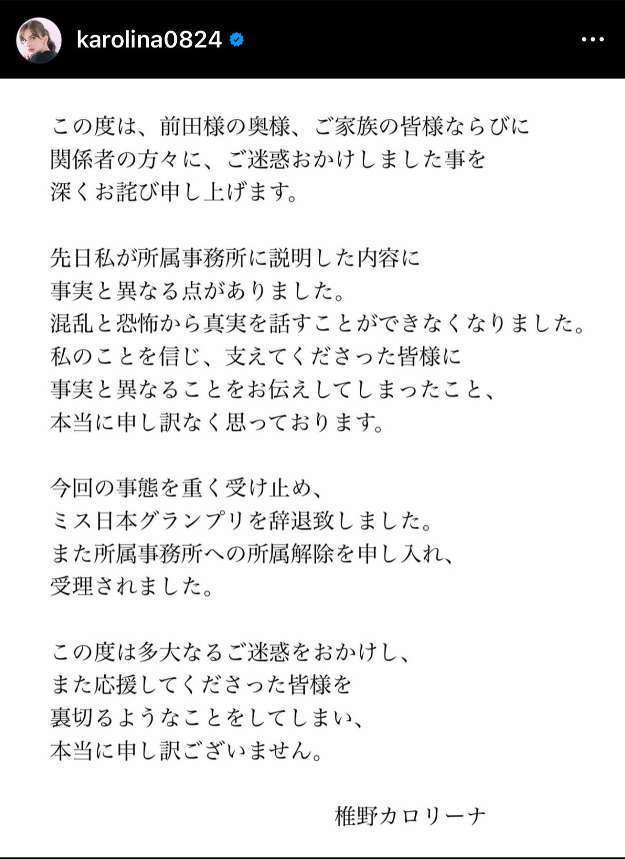 ซึ่งเมื่อวานนี้ “แคโรไลนา ชิอิโนะ” ได้ประกาศสละตำแหน่ง “มิสเจแปน 2024” แล้ว และล่าสุดเธอออกมาเปิดใจผ่านอินสตาแกรม เป็นภาษาญี่ปุ่น สรุปใจความได้ว่า “ขอโทษภรรยาและครอบครัวของฝ่ายชายสำหรับสิ่งที่เกิดขึ้น สิ่งที่ฉันอธิบายให้กองประกวดฟังมีเรื่องที่แตกต่างจากความจริง ความสับสนและกลัว ทำให้ฉันพูดความจริงไม่ได้