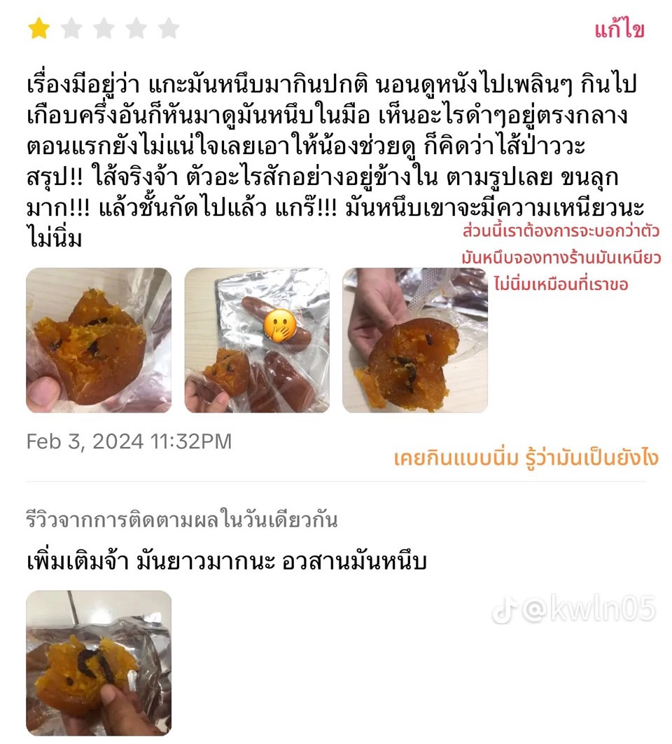(7 ก.พ.) เตือนภัย สาวสั่ง "มันหนึบ" กัดเข้าไปเจอ "สิ่งปริศนา" ตัวสีดำ ยาวประมาณ 7 ซม. ล่าสุดเจ้าของโพสต์เผยมีการติดต่อไปเคลียร์กับทางร้าน