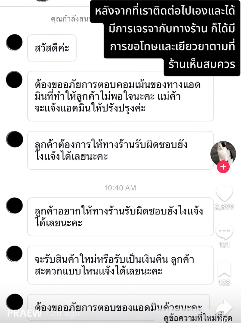 ทีมข่าวได้ติดต่อไปยังเจ้าของโพสต์ดังกล่าว ผู้ใช้บัญชี TikTok ชื่อ @kwln05 ระบุว่า "หลังจากเรารีวิวสินค้าไป ก็ได้ทักไปทางร้านเราขอเป็นการเยียวยา และขอให้ร้านโพสต์ขอโทษต่อสาธารณะ แต่ทางร้านว่าเราเรียกสูงไป ตามที่ร้านเห็นสมควรก็ได้เยียวยามาเป็นจำนวนหนึ่งค่ะ มีการยืนยันว่าจะให้ส่งของคืนเพื่อนำไปตรวจสอบ อ้างว่าโรงงานได้มาตรฐานไม่เคยเกิดเหตุการณ์แบบนี้ขึ้น เราได้แจ้งไปตามตรงว่าเราไม่สะดวกแต่ขอรูปเพิ่มได้ ทำให้ทางร้านทำเหมือนจะไม่รับผิดชอบถ้าเราไม่ส่งของไปส่วนหนึ่ง เราตกลงแบบไม่สะดวกใจไป