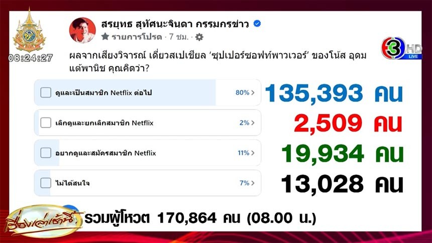 ดรามาร้อน ‘โน้ส อุดม’ พูดเรื่องพอเพียง ‘สรยุทธ’ ทำโพลถามแฟนข่าว จะดูและเป็นสมาชิก Netflix ต่อไปหรือไม่?