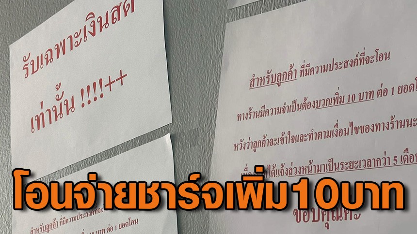 (20 มิ.ย.) ผู้ใช้เฟซบุ๊กบัญชีรายชื่อรายหนึ่งโพสต์รูปภาพป้ายในร้านค้าที่ระบข้อความว่า "รับเฉพาะเงินสดเท่านั้น!!!!++ สำหรับลูกค้าที่มีความประสงค์ที่จะโอน ทางร้านมีความจำเป็นต้องบวกเพิ่ม 10 บาท ต่อ 1 ยอดโอน หวังว่าลูกค้าจะเข้าใจและทำตามเงื่อนไขของร้านนะคะ เนื่องจากได้แจ้งล่วงหน้ามาเป็นระยะเวลากว่า 5 เดือนแล้ว ขอบคุณค่ะ"