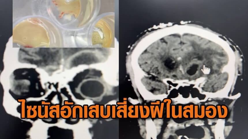 พร้อมโชว์ภาพเอกซเรย์จะเห็นสมองส่วนหน้าฝั่งซ้ายมีฝีอยู่ 2 ก้อน คนไข้เป็นไซนัสอักเสบมา 1 เดือน มีไข้สูงขึ้นเรื่อยๆ ปวดศรีษะ ล่าสุดเป็นฝีในสมอง หมอยังบอกอีกว่าความอันตรายของฝีก้อนนี้คือ ถ้าเกิดแตกเข้าไปในน้ำเลี้ยงสมองจะส่งผลให้เสียชีวิต ต้องรีบรับการผ่าตัดดูดเอาหนองออก เหลือผนังที่ติดกับช่องน้ำเลี้ยงสมองไว้ หลังผ่าตัดเคสนี้ต้องรักษาต่อด้วยการให้ยาอีกหลายสัปดาห์ เข้าเช็กอย่างต่อเนื่องหากไม่มีฝีแล้วถึงหยุดการรักษาได้