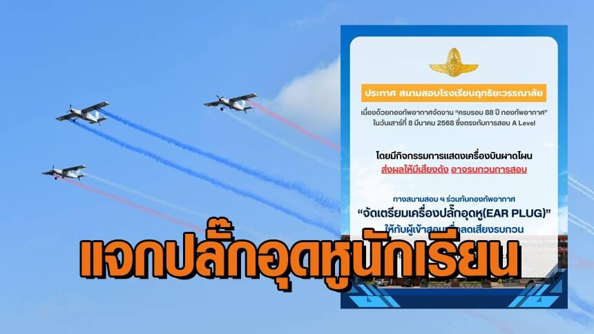 รร.ฤทธิยะวรรณาลัย เตรียมแจกที่อุดหูให้นักเรียนสอบ A Level รับมือเสียงรบกวน ทอ.โชว์ฝูงบิน