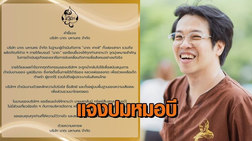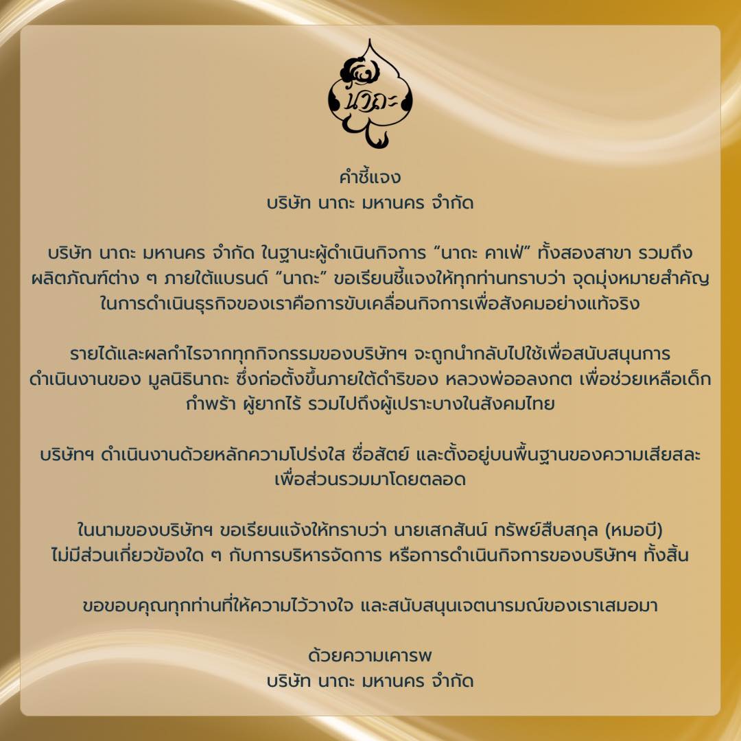 “บริษัท นาถะ ในฐานะผู้ดำเนินกิจการ “นาถะ คาเฟ่” ทั้งสองสาขา รวมถึงผลิตภัณฑ์ต่าง ๆ ภายใต้แบรนด์ “นาถะ” ขอเรียนชี้แจงให้ทุกท่านทราบว่า จุดมุ่งหมายสำคัญในการดำเนินธุรกิจของเราคือการขับเคลื่อนกิจการเพื่อสังคมอย่างแท้จริง