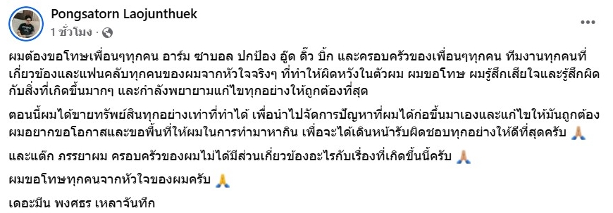“ผมต้องขอโทษเพื่อนๆ ทุกคน อาร์ม ซาบอล ปกป้อง อู๊ด ดิ๊ว บิ้ก และครอบครัวของเพื่อนๆ ทุกคน ทีมงานทุกคนที่เกี่ยวข้องและแฟนคลับทุกคนของผมจากหัวใจจริงๆ ที่ทำให้ผิดหวังในตัวผม ผมขอโทษ ผมรู้สึกเสียใจและรู้สึกผิดกับสิ่งที่เกิดขึ้นมากๆ และกำลังพยายามแก้ไขทุกอย่างให้ถูกต้องที่สุด