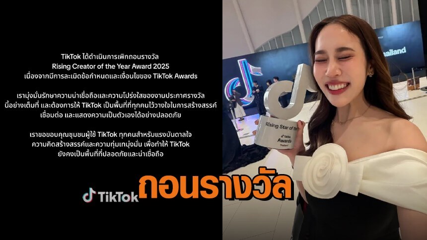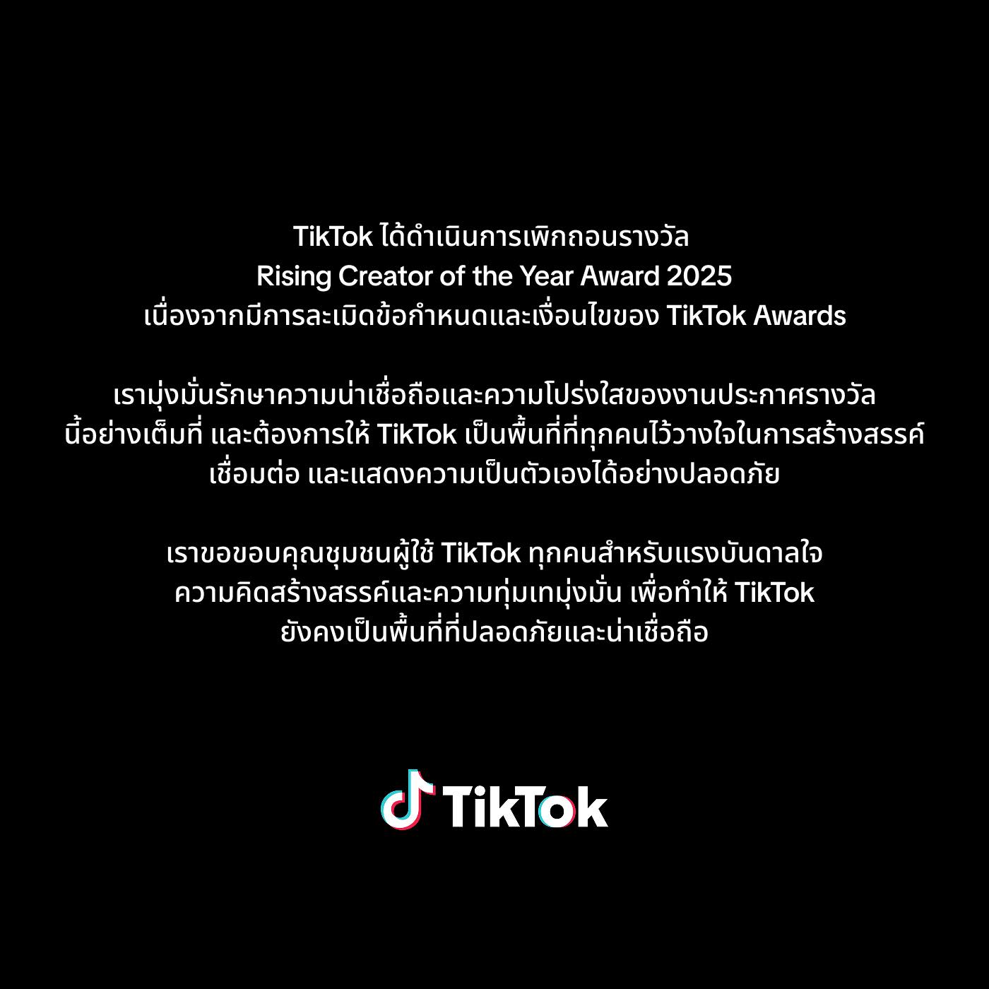 ล่าสุด TikTok ได้ดำเนินการเพิกถอนรางวัล Rising Creator of the Year Award 2025 โดยระบุเหตุผล เนื่องจากมีการละเมิดข้อกำหนดและเงื่อนไขของ TikTok Awards