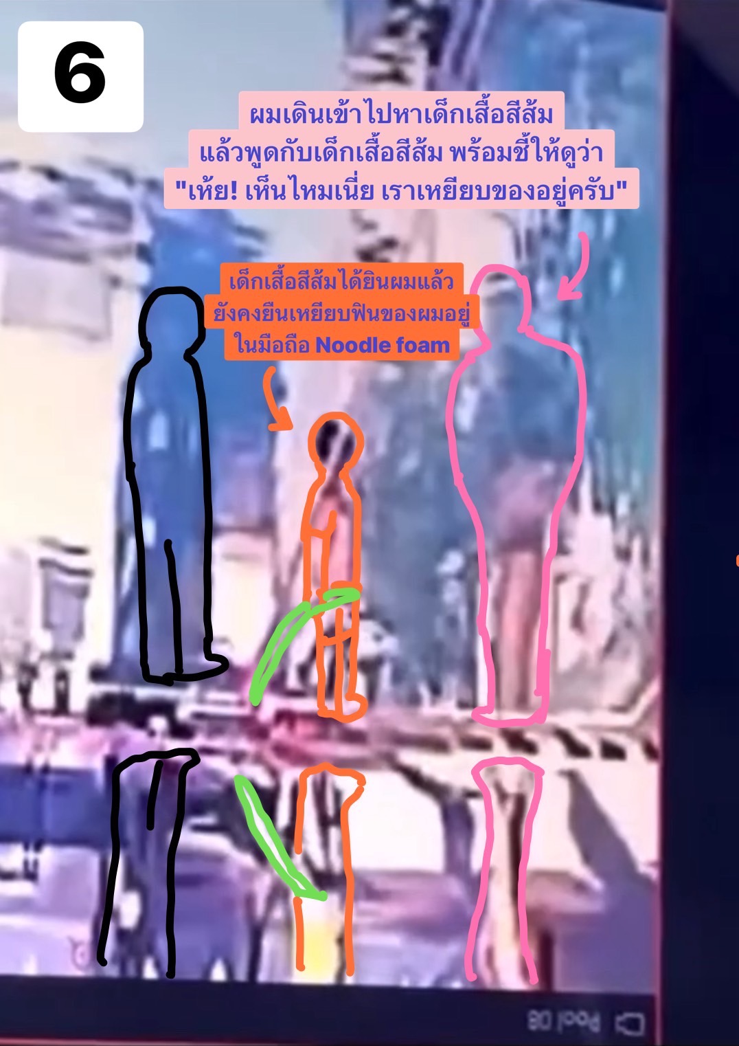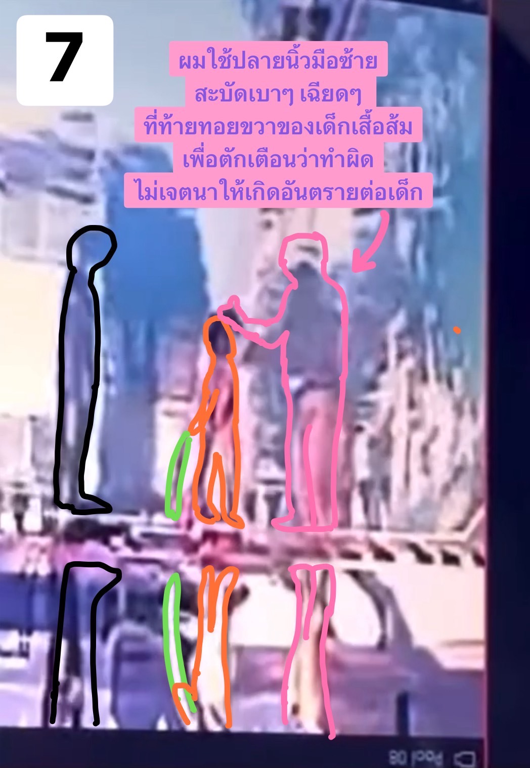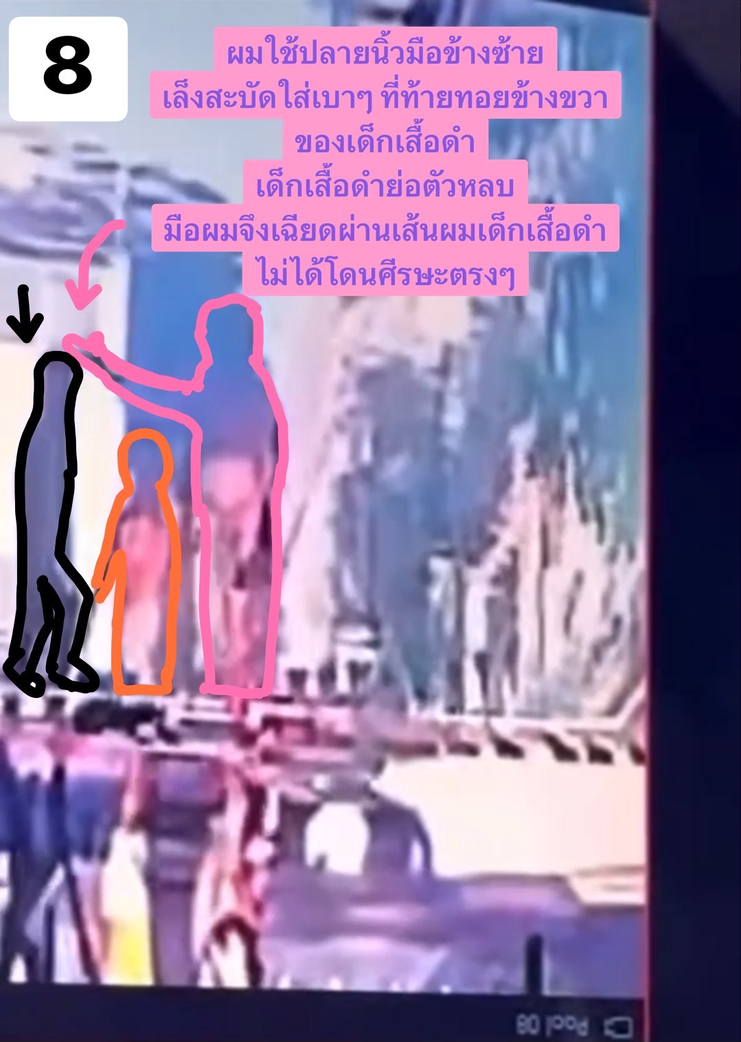 โดยใช้ปลายนิ้วมือข้างซ้ายตีเฉียดเบาๆ ที่ท้ายทอยด้านขวาของเด็กเสื้อสีส้มที่ตัวเล็กกว่าก่อน แล้วหยิบ Noodle foam ออกมาจากมือเด็กเสื้อสีส้ม จากนั้นจึงใช้ปลายนิ้วมือข้างซ้ายเล็งตีเฉียดเบาๆ ที่ท้ายทอยด้านขวาของเด็กชายเสื้อดำที่ตัวสูงกว่าที่ยืนอยู่ด้านหลังด้วย เด็กเสื้อดำย่อตัวหลบ มือผมจึงได้เฉียดเส้นผมด้านบนศีรษะไม่ได้โดนศีรษะของเด็กเสื้อดำตรงๆ (โดยที่ผมไม่ได้ตบถูกบริเวณขมับหรือบ้องหูของเด็กทั้งสองคนแต่อย่างใด)