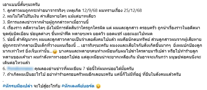 4. เรื่องราว คดีความใดๆ ยังไม่มีการตัดสินว่าใครถูกใครผิด แต่ผมและลูกสาว ครอบครัว ถูกนำเรื่องราวในอดีตมาขุดคุ้ยบิดเบือน ข้อมูลต่างๆ ขึ้นหน้าฟีด หลายๆ เพจ ยอดวิว ยอดแชร์ เยอะแยะไปหมด