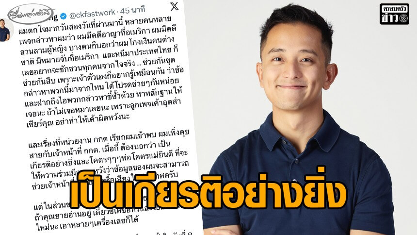 ล่าสุด (4 ก.พ.) ซีเค เจิง โพสต์ข้อความผ่านเอ็กซ์ (X) ระบุว่า “ผมตกใจมากวันสองวันที่ผ่านมานี้ หลายคนหลายเพจกล่าวหาผมว่า ผมมีคดีอาญาที่อเมริกา ผมมีคดีลวนลามผู้หญิง บางคนก็บอกว่าผมโกงเงินคนต่างชาติ มีหมายจับที่อเมริกา และหนีมาประเทศไทย ก็เลยอยากจะชักชวนทุกคนจากใจจริง .. ช่วยกันขุด ช่วยกันสืบ เพราะเจ้าตัวเองก็อยากรู้เหมือนกัน ว่าข้อกล่าวหาพวกนี้มาจากไหน ได้โปรดช่วยๆกันหน่อย และฝากถึงไอพวกกล่าวหาซี้ซั้วด้วย หาหลักฐานให้เจอนะ ถ้าไม่เจอหมาเลยนะ เพราะลูกเพจเค้าอุตส่าเชียร์คุณ อย่าทำให้เค้าผิดหวังนะ