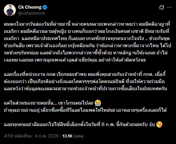 “ซีเค” โพสต์เป็นเกียรติอย่างยิ่ง กกต.เรียกสอบปมโพสต์อ้างยายรับเงินซื้อเสียง ลั่นหวังว่าจะช่วยเจ้าหน้าที่ปราบการซื้อเสียงในประเทศ