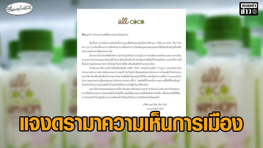 วันที่ 29 ก.พ.2569 บริษัท ออล โคโค กรุ๊ป จำกัด ออกแถลงการณ์ สืบเนื่องจากประเด็นความคิดเห็นที่ปรากฏบนสื่อสังคมออนไลน์ในช่วงที่ผ่านมา บริษัท ออล โคโค กรุ๊ป จำกัด (AII Coco) ขอเรียนชี้แจงว่าความคิดเห็นทางการเมืองดังกล่าวเป็นเพียงมุมมองส่วนบุคคล ซึ่งมิได้สะท้อนถึงจุดยืนหรือนโยบายหลักของบริษัทแต่ประการใด