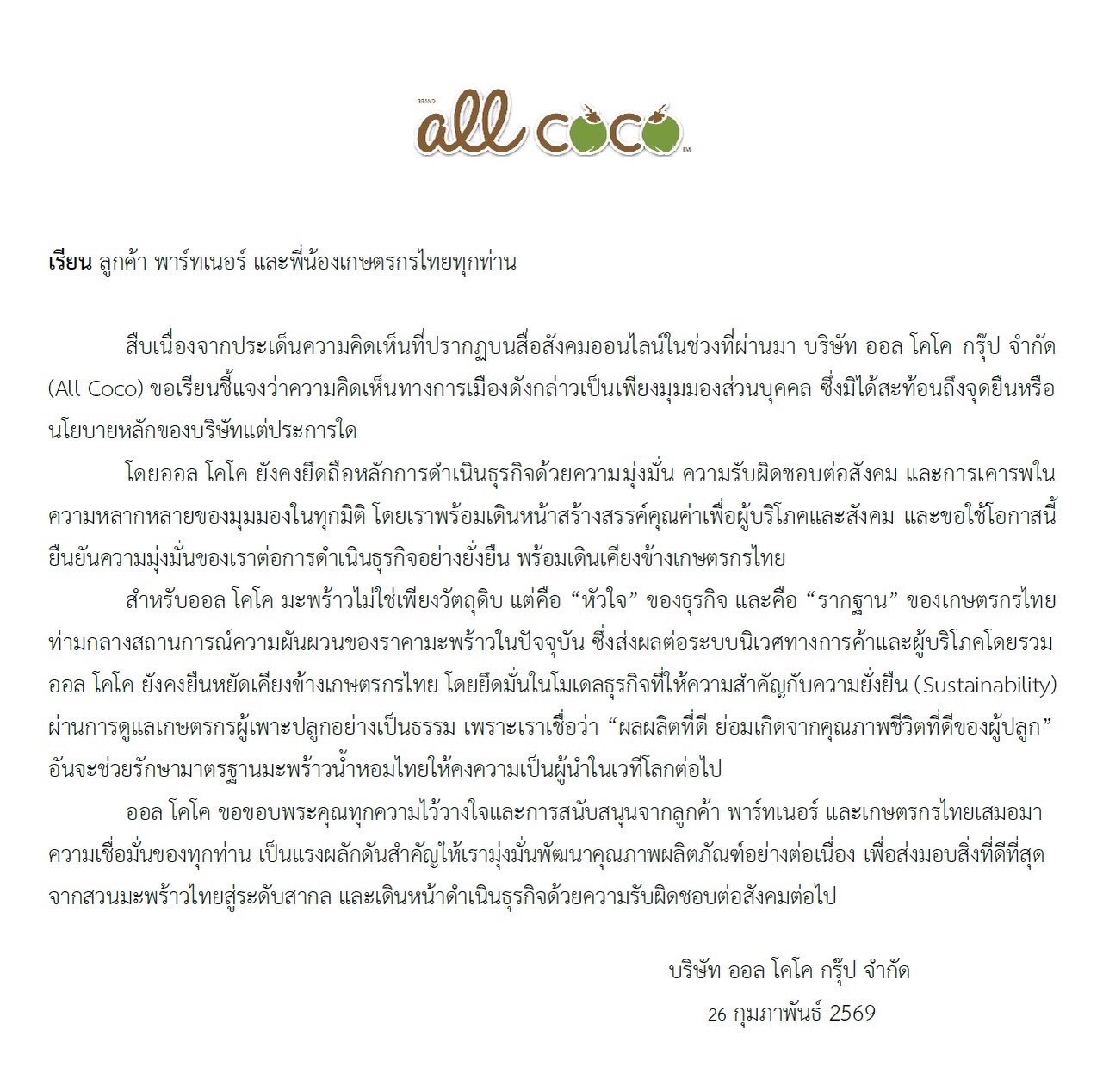 โดยออล โคโค ยังคงยึดถือหลักการดำเนินธุรกิจด้วยความมุ่งมั่น ความรับผิดชอบต่อสังคม และการเคารพในความหลากหลายของมุมมองในทุกมิติ โดยเราพร้อมเดินหน้าสร้างสรรค์คุณค่าเพื่อผู้บริโภคและสังคม และขอใช้โอกาสนี้ ยืนยันความมุ่งมั่นของเราต่อการดำเนินธุรกิจอย่างยั่งยืน พร้อมเดินเคียงข้างเกษตรกรไทย