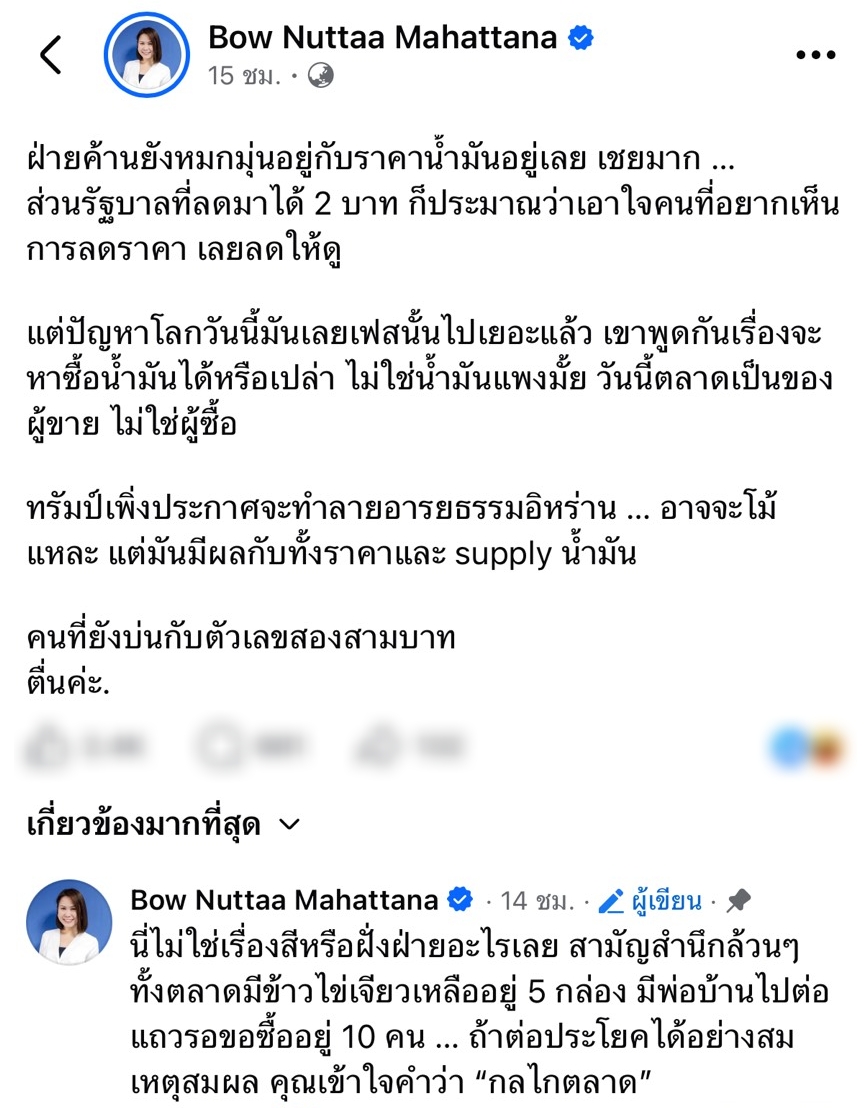 เมื่อวันที่ 7 เมษายน 2569 ผู้สื่อข่าวรายงานว่า ณัฏฐา มหัทธนา หรือ “โบว์ ณัฏฐา” อดีตโฆษกศูนย์บริหารและติดตามสถานการณ์การสู้รบในภูมิภาคตะวันออกกลาง (ศบก.) โพสต์เฟซบุ๊กส่วนตัวแสดงความเห็นสถานการณ์น้ำมัน โดยระบุว่า