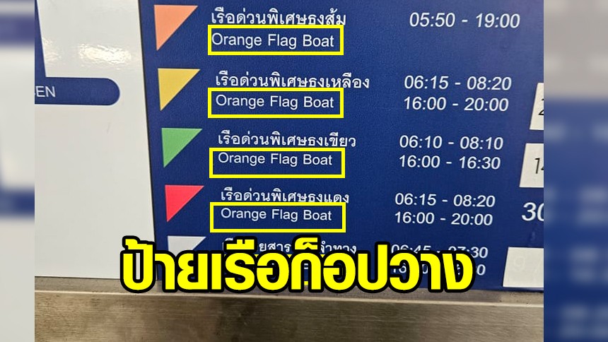 กลายเป็นประเด็นที่ถูกแชร์ต่อในโลกออนไลน์ เมื่อผู้ใช้เฟซบุ๊กรายหนึ่ง โพสต์ภาพตารางบอกเวลาการเดินเรือด่วนพิเศษ ลงกลุ่มเฟซบุ๊ก TIT (This is Thailand) ภาษาไทย อ่านแล้วเข้าใจได้ แต่พอเป็นภาษาอังกฤษ ต้องรอย้อนอ่านอีกสักรอบ เพราะเส้นทางหลัก แยกตามสีของธง แต่ป้ายภาษาอังกฤษ กลับเป็น Orange Flag Boat หมดเลย ทำเอาถึงกับงง
