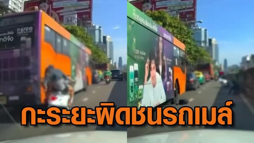 กะระยะผิดชีวิตเปลี่ยน! กล้องหน้ารถจับภาพ จยย.ซิ่งมุดช่องจราจร พลาดชนท้ายรถเมล์เจ็บ ก่อนลุกขึ้นขี่หนี