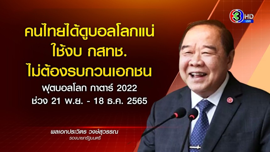 วันที่ 1 พ.ย. 2565 รายงานข่าวจากที่ประชุมคณะรัฐมนตรี (ครม.) แจ้งว่า พล.อ.ประวิตร วงษ์สุวรรณ รองนายกรัฐมนตรี ได้กล่าวกับที่ประชุม ครม. ว่า คนไทยจะได้ชมฟุตบอลโลกแน่นอน ส่วนงบประมาณหลักในการถ่ายทอดสดจะใช้งบจาก กสทช. ไม่ต้องรบกวนเอกชน โดยจะมีการถ่ายทอดสดระหว่างวันที่ 20 พฤศจิกายน ถึง 18 ธันวาคม 2565