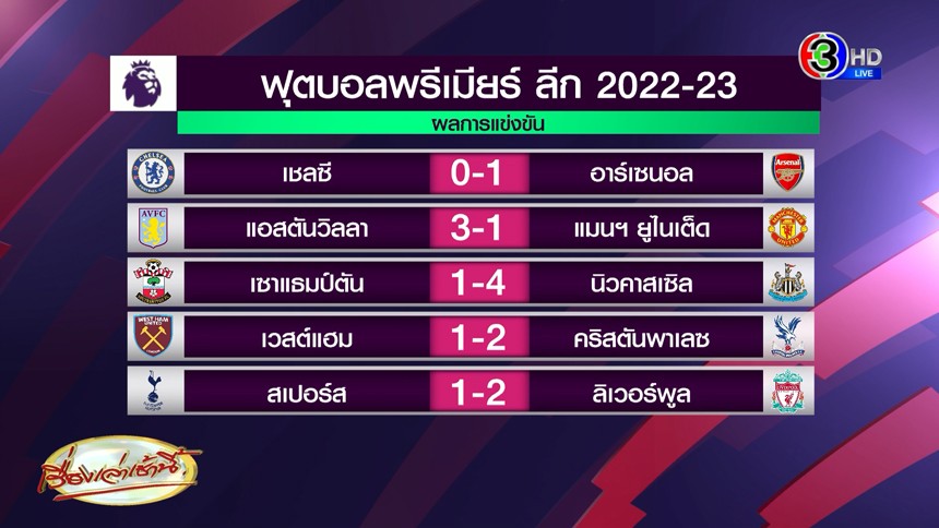 'ปืนใหญ่' ยังแรงแซงขึ้นจ่าฝูง หลังเฉือนเชลซี 1 ลูก - 'หงส์' จิก 'ไก่' 1-2 ส่วนแมนยูพ่ายให้วิลลา 3-1