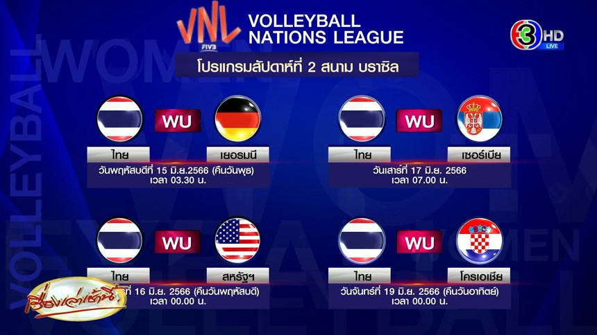 เวลา 03.00 น. คืนวันที่ 14 เข้าวันที่ 15 มิ.ย. 66 ศึกวอลเลย์บอลหญิง เนชั่นส์ลีก 2023 ทัพลูกยางสาวไทย มีคิวตบกับ ทีมชาติเยอรมนี