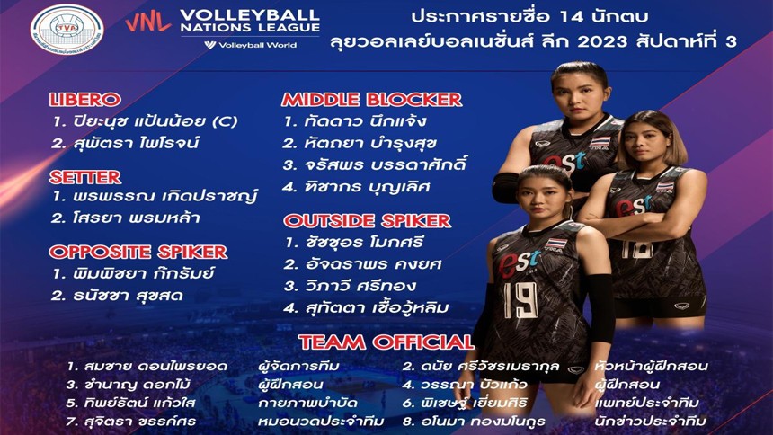 สมาคมวอลเลย์บอลแห่งประเทศไทย ประกาศรายชื่อ 14 นักกีฬาวอลเลย์บอลหญิง ที่จะลงทำการแข่งขันในศึกวอลเลย์บอลเนชั่นส์ ลีก 2023 (VNL 2023) สัปดาห์ที่ 3 ที่กรุงเทพมหานคร ประเทศไทย ออกมาเป็นที่เรียบร้อย