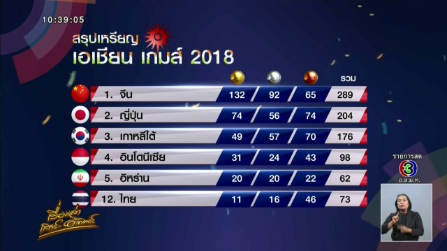 สรุปเหรียญเอเชียนเกมส์ 2 ก.ย.61 ไทยรั้งอันดับ 12 มี 11 ทอง 16 เงิน 46 ทองแดง