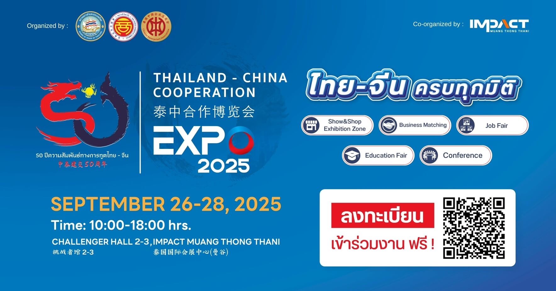 อิมแพ็ค เมืองทองธานี ร่วมกับคณะกลไกประสานงานและส่งเสริมธุรกิจไทย-จีนอย่างยั่งยืน นำโดย สภาหอการค้าแห่งประเทศไทย หอการค้าไทย-จีน และสมาคมการค้าวิสาหกิจจีนในไทยประกาศความพร้อมขับเคลื่อนเศรษฐกิจไทย เตรียมจัดงานใหญ่ “Thailand-China Cooperation Expo 2025” บนพื้นที่ 40,000 ตารางเมตร อัดแน่นด้วยกิจกรรมระดับนานาชาติที่สะท้อนถึงความร่วมมือไทย-จีนในทุกมิติ ทั้งการค้า การลงทุน การจับคู่ธุรกิจ Job Fair Education Fair และโปรโมชันพิเศษจากแบรนด์ดังเพียบ วันที่ 26-28 กันยายน 2568 ณ อาคารชาเลนเจอร์ 2-3 อิมแพ็ค เมืองทองธานี