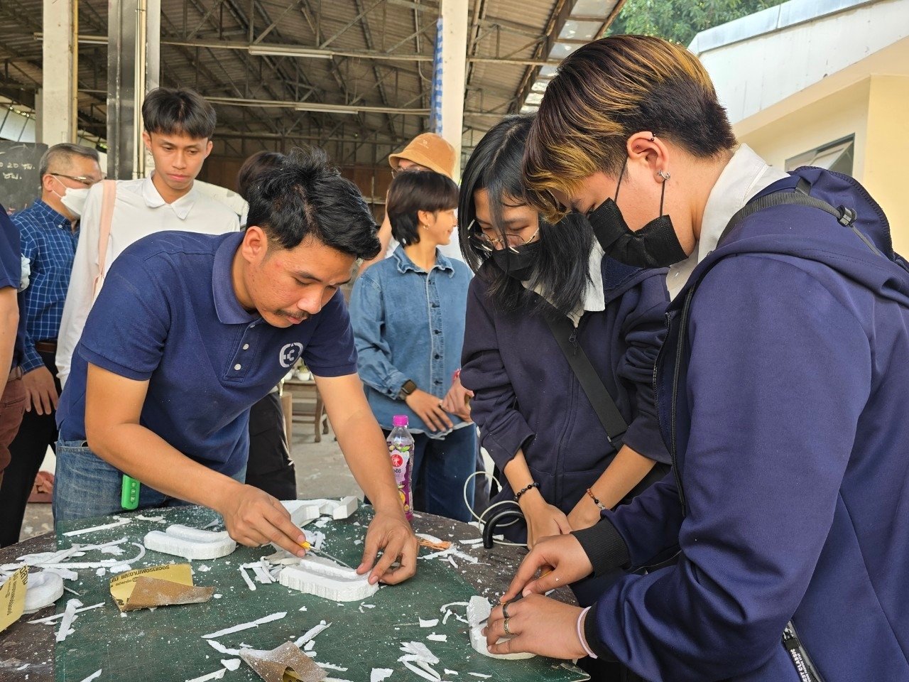 จากนั้นคณะนักศึกษาได้มีโอกาสร่วม workshop ในส่วนของการออกแบบงานวิจิตรศิลป์ จากทีมเจ้าหน้าที่ของสถานีฯ ในการผลิตชิ้นงานจากโฟม สำหรับงานตกแต่ง และประกอบฉาก ซึ่งเป็นเทคนิคพิเศษที่ทางทีมศิลปกรรมช่อง 3 คิดค้นและประดิษฐ์เครื่องมือเฉพาะทางขึ้น เพื่อตอบโจทย์กับปริมาณงานและเวลาในการปฏิบัติงาน นับเป็นการส่งท้ายสำหรับการศึกษาดูงานในครั้งนี้ได้เป็นอย่างดี
