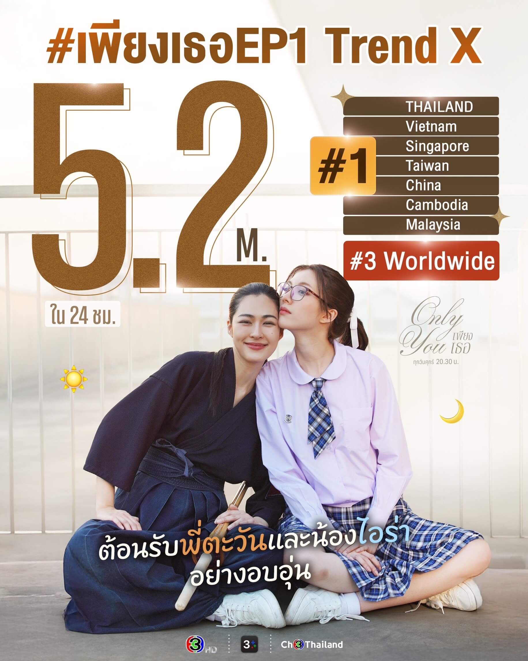 เปิดตัวยิ่งใหญ่สมการรอคอย สำหรับ “เพียงเธอ Only You The Series” ทางช่อง 3 ซีรีส์เรื่องที่สองของ “หลิงหลิง คอง” และ “ออม กรณ์นภัส” ที่สร้างกระแสถล่มทลายตั้งแต่เปิดตัวตอนแรกส่งผลให้แฮชแท็ก #เพียงเธอEP1 ทะยานติดเทรนด์ X อันดับ 1 ประเทศไทย ภายใน 5 นาที ยอดรีโพส 1M ภายในเวลา 3 ชั่วโมง และมียอดทวิตกว่า 5.2 ล้าน ภายใน 24 ชั่วโมง พร้อมติดอันดับ 3 เทรนด์โลก และติดเทรนด์อีก 21 พื้นที่ ประกาศความปัง “หลิง-ออม” ฟีเวอร์ไปทั่วโลก