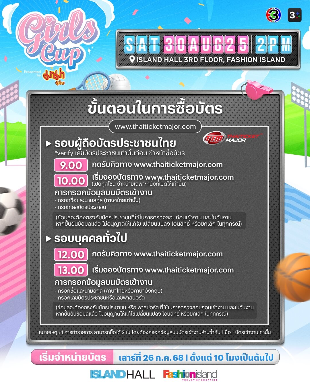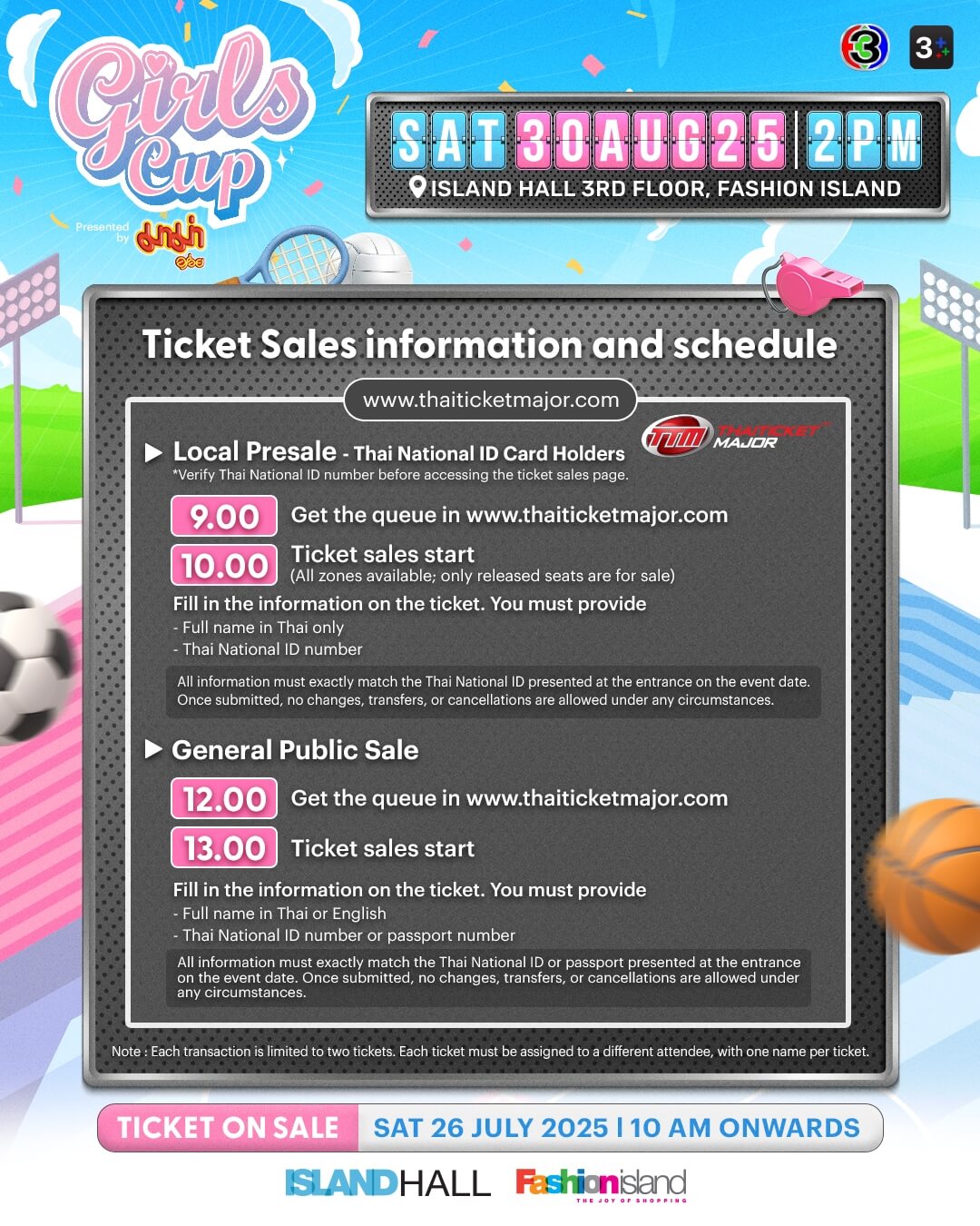 เตรียมเสียงเชียร์ให้พร้อม แล้วรีบจับจองบัตรให้ทัน ในวันเสาร์ที่ 26 กรกฎาคม 2568 ทาง www.thaiticketmajor.com โดยจะแบ่งเป็น 2 รอบการจอง 10.00 – 12.00 น. สำหรับผู้ถือบัตรประชาชนไทย และ 13.00 น. เป็นต้นไป รอบทั่วไป ราคาบัตรมีให้เลือก 3 ราคา