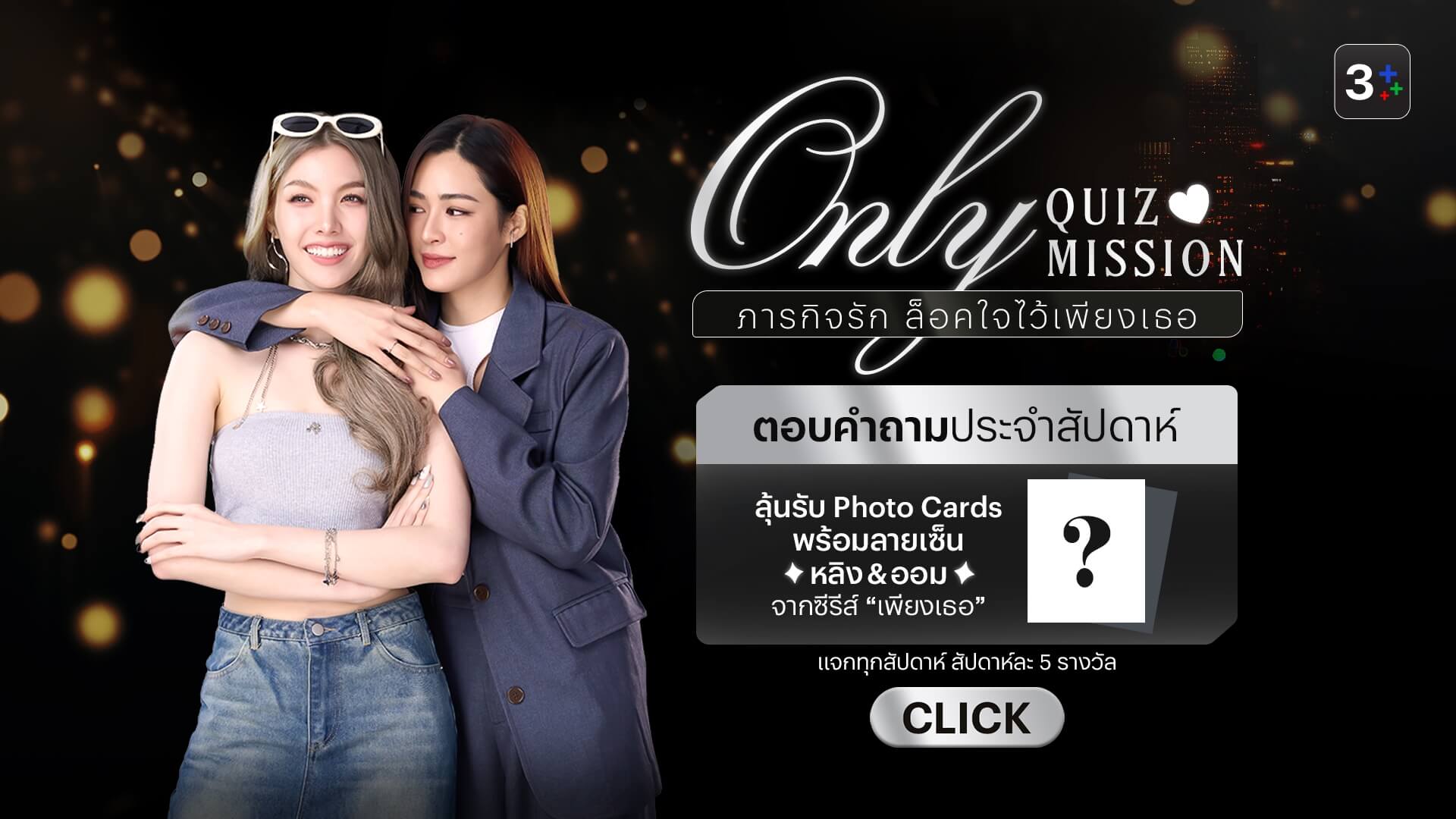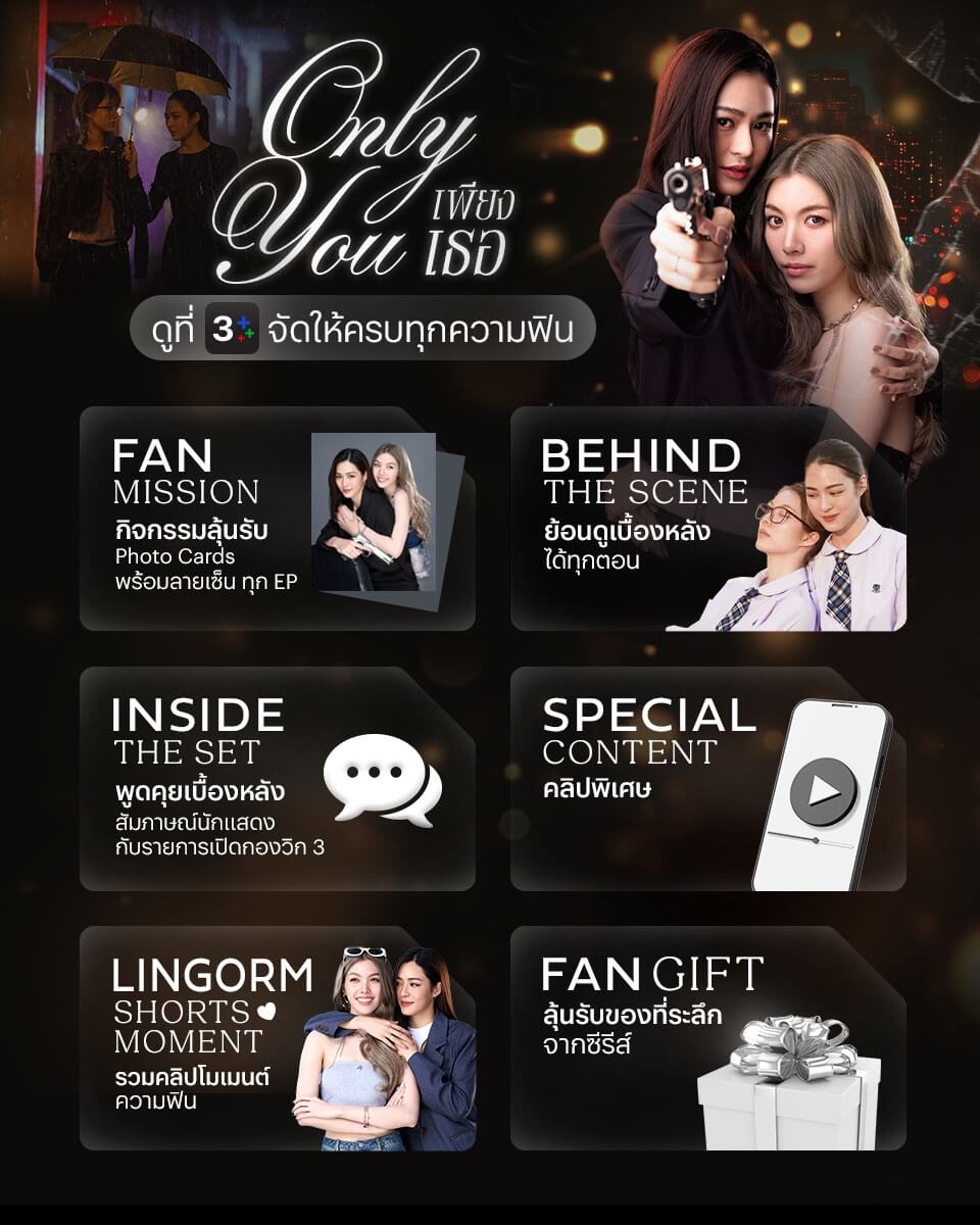 ร่วมสนุกกับกิจกรรม “Only Quiz Mission” ได้ง่าย ๆ เพียงตอบคำถามประจำสัปดาห์เกี่ยวกับเนื้อหาใน EP ที่เพิ่งดูจบ ผ่านเว็บไซต์หรือแอป 3Plus ลุ้นรับ Photo Cards สุดเอ็กซ์คลูซีฟพร้อมลายเซ็นจาก
