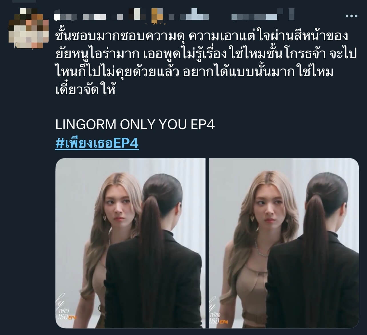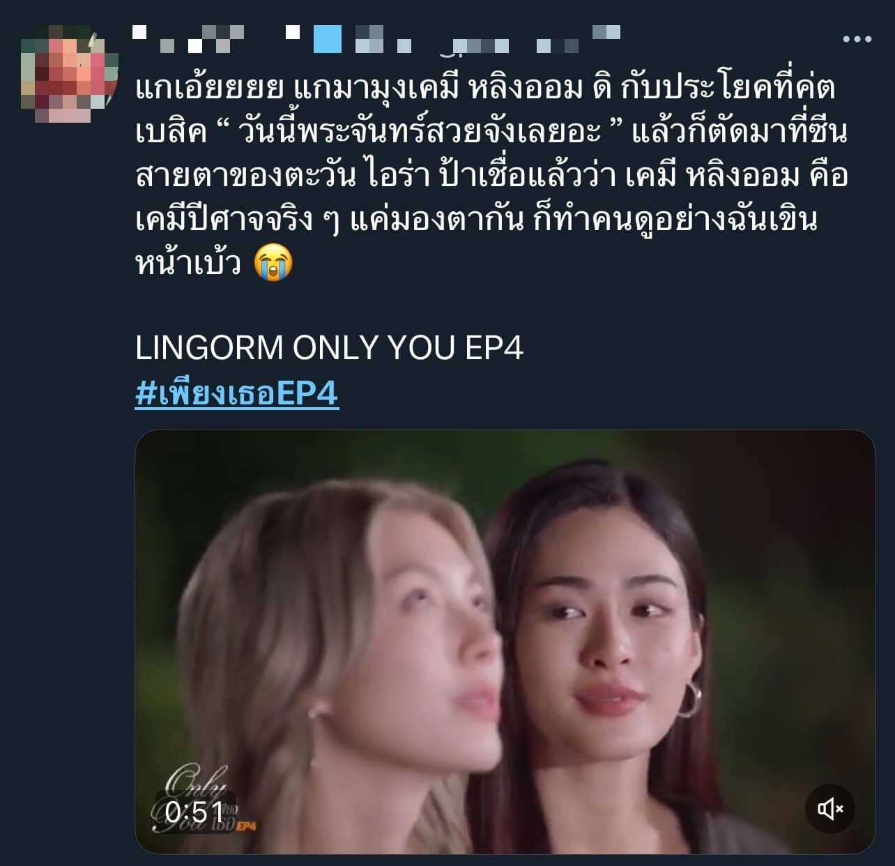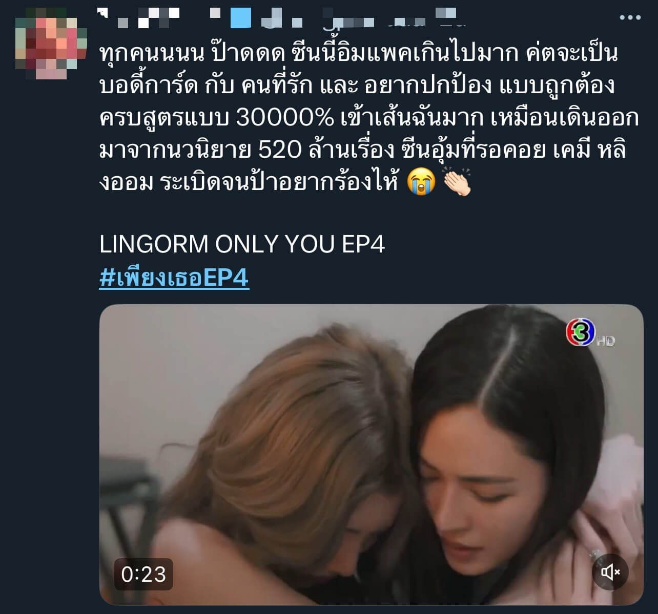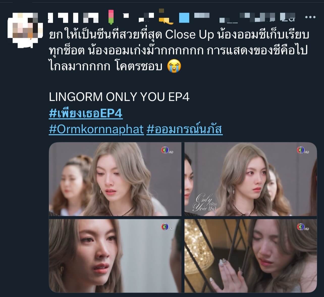 สร้างปรากฏการณ์ความฟินไปทั่วโลกจริง ๆ สำหรับสองสาว “หลิงหลิง คอง” และ “ออม กรณ์นภัส” ในซีรีส์ “เพียงเธอ Only You The Series” จากทางช่อง 3 ที่โกยกระแสความปังไปอย่างล้นหลาม อีกทั้งยังครองใจ แฟน ๆ ชาวไทยและต่างประเทศไปได้ทุกตอน ล่าสุดของ อีพี 4 ทำคนดูถึงกับใจสั่นกับฉากที่ พี่ตะวัน (หลิงหลิง คอง) ปกป้อง ไอร่า (ออม กรณ์นภัส) จากคนร้าย ก่อนที่คนดูจะหลั่งน้ำตากับซีนดราม่ากับคำพูดประโยคเด็ด “พี่ไม่ใช่ตัวเลือกที่ดี”