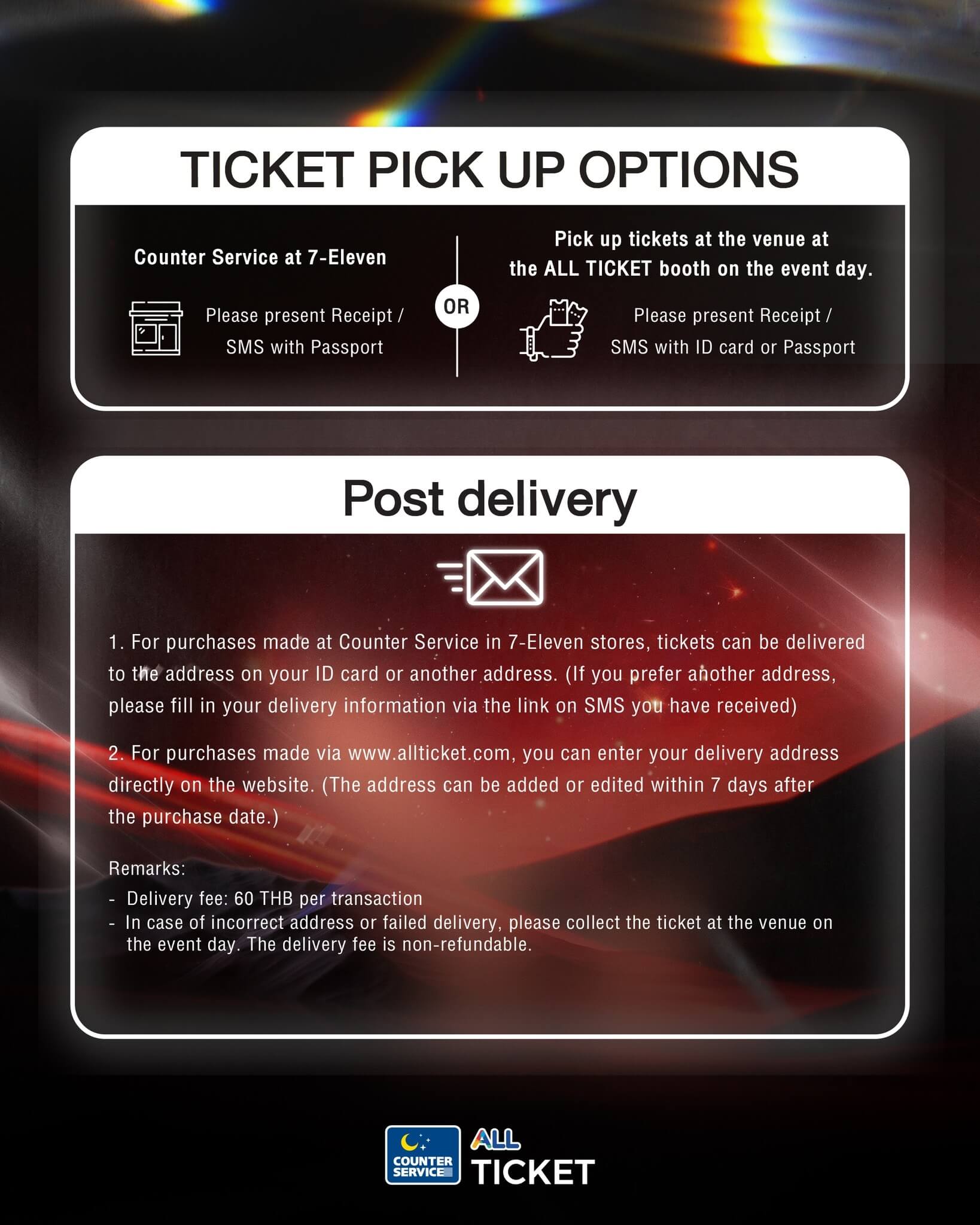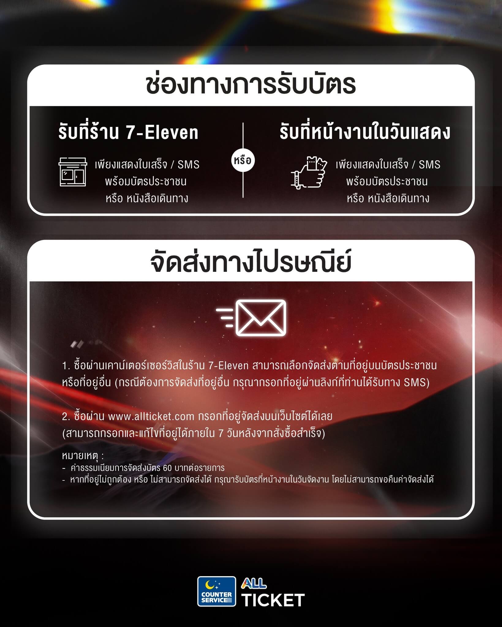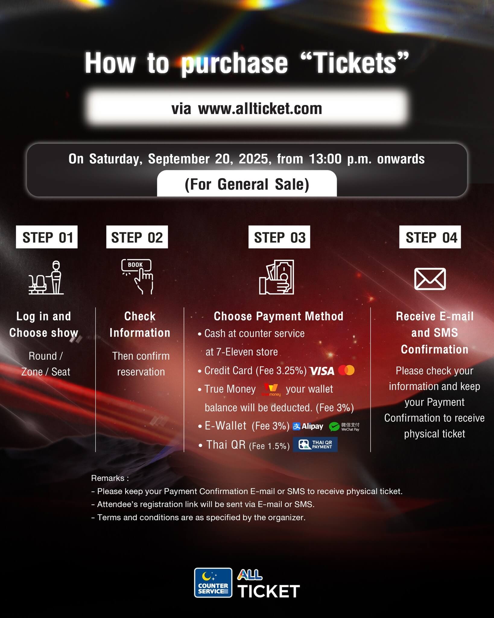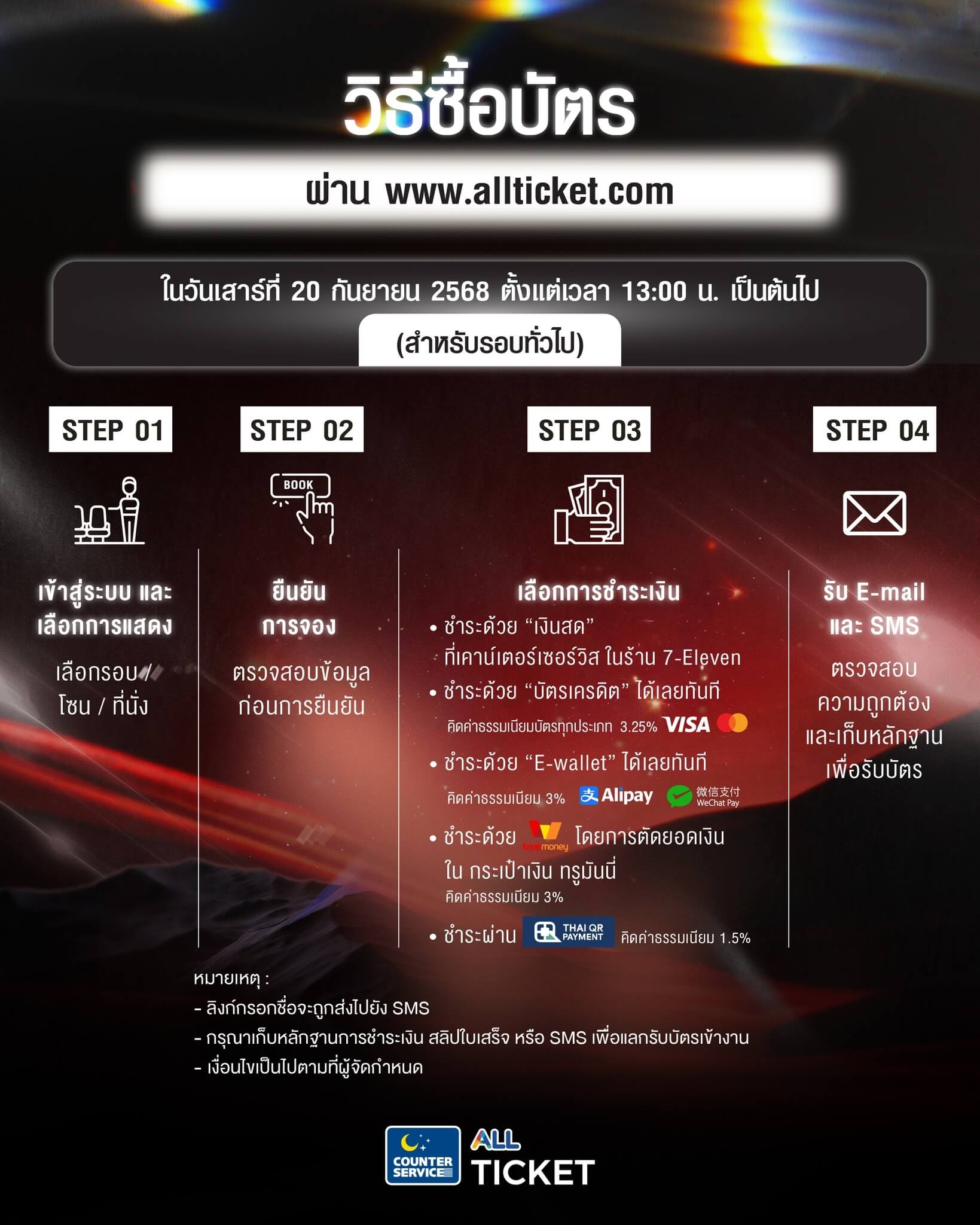 เริ่มจำหน่ายบัตร วันเสาร์ที่ 20 กันยายนนี้ ทางเคานท์เตอร์เซอร์วิสของ 7-11 ทั่วไทยและเว็บไซต์ All ticket บัตรราคา 6,500 / 6,000 / 5,500 / 5,000 / 4,800 / 3,800 / 2,800 / 2,500 / 1,500 บาท สำหรับผู้ที่ต้องการประสบการณ์แบบ Exclusive ยังมี VIP Rooms 8 ห้อง ราคาที่นั่งละ 7,800 บาท และ VVIP ROOMS มีทั้งหมด 4 ห้อง ราคาที่นั่งละ 8,800 บาท